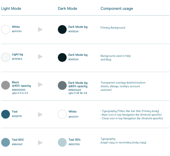 Implementing a Dark theme is fairly straightforward. The difficult part is defining rules so your app looks consistent throughout and your design team doesn’t double their work. At the start of our redesign project our UX team helpfully devised a set of global rules to define what colours certain components were in Light and Dark mode: