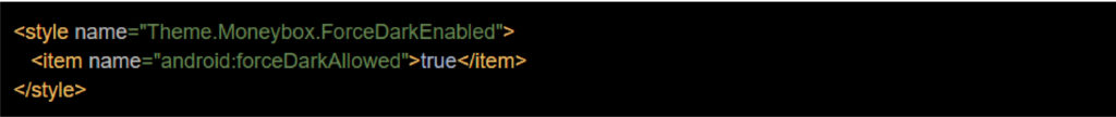 Before our redesign we wanted a quick win which would make our screens dark mode compatible with very little work. This is where “force dark” comes in handy. It allows Android to take over and invert the colours on the screen. You can achieve this by setting force dark in your activities/components style: