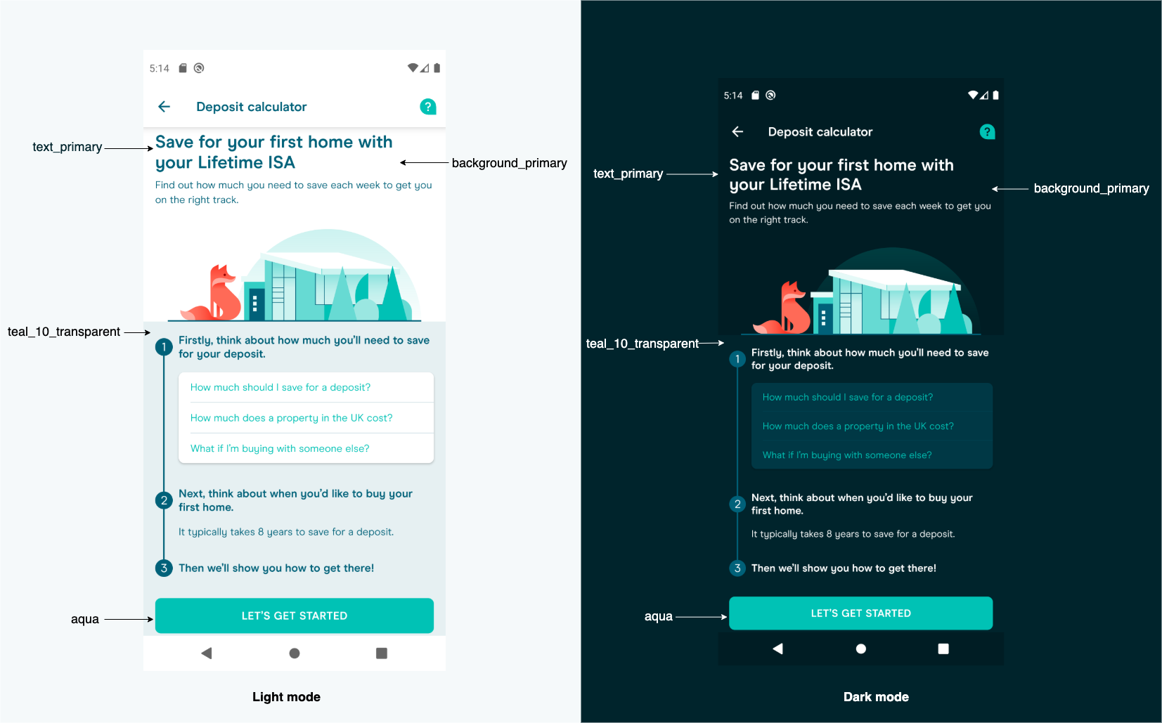 This allows us to refer to our component colours in xml e.g. @color/background_primary, as opposed to a standard colour such as @color/white which only works in Light mode. You can still use real colours in xml but only if you want that component to be the same colour in both modes. Below is a screen from our house buying calculator, a tool designed to help our customers save for their first home: