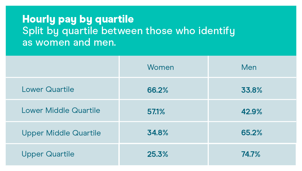As at April 2023, our mean gender pay gap was 29.4% and our median gender pay gap was 36.7%. The key reason for this gap is that our lowest paid quartile of team members is made up of 66.2% women, and our highest paid quartile of team members is made up of 74.7% men. This is largely driven by our engineering (tech) team, where salaries are comparably higher across the industry. We have fewer females in our engineering team at Moneybox, which is reflective of the candidate market within the UK (around 26% of UK tech roles are held by women). The increase in our gender pay gap since April 2022 is largely a result of industry salary benchmark changes and some promotions in teams that were already majority represented by men, most notably in engineering. As described above, this representation is something we are actively working to address.
