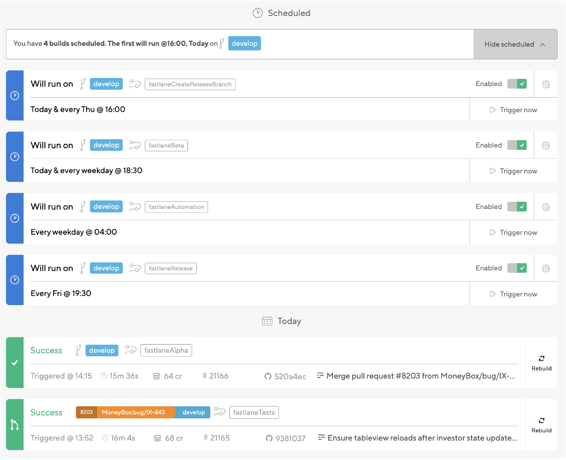 A QA build is also made which points to our regression environment so that QA can do final manual regression testing before we send out the new version to external TestFlight users on a Friday afternoon. If any bugs are found at this point (or over the weekend) then they can be fixed and merged into this /release branch and this step will automatically be rerun and new builds are triggered for us.