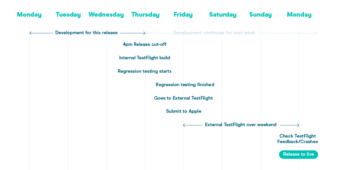 We now use the concept of a “release train”. At a set time each week, code that is currently merged in our develop branch gets bundled into a release. If a feature is ready to release at that time then it catches the train, but if there is still outstanding work then it misses the train and goes into the next week’s release.