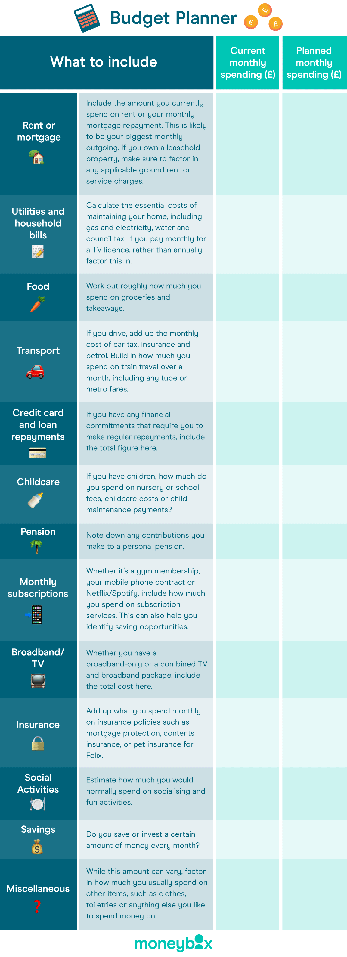 When completing a budget planner, try to picture your monthly spending right now, as well as once you’ve moved into your new home or remortgaged. Will you spend more or less than you do now?