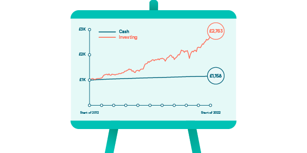 For example, £1,000 invested in our Balanced Starting Option at the start of 2012 would’ve been worth £2,763 at the start of 2022, compared to just £1,158 if saved in cash.