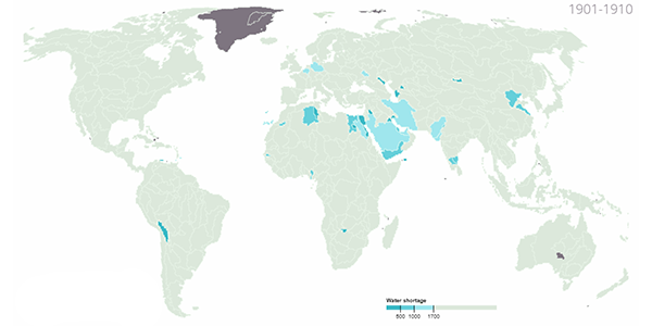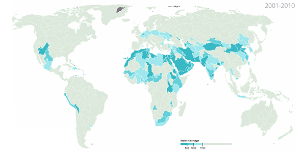 Here’s another graph showing the same thing, but using data for 2001 to 2010. It shows that areas of the world which were not at risk of water shortages at all in the 1900s were experiencing water shortages just a century later.