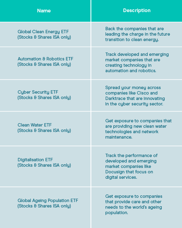 If the risk-to-reward potential of thematic investing suits your individual appetite for risk, open a Stocks & Shares ISA to invest in our range of thematic ETFs. Just remember, investing carries a certain amount of risk, and you might get back less than you invest. That’s why it’s important to invest for more than five years, to give your money time to recover from any dips along the way.