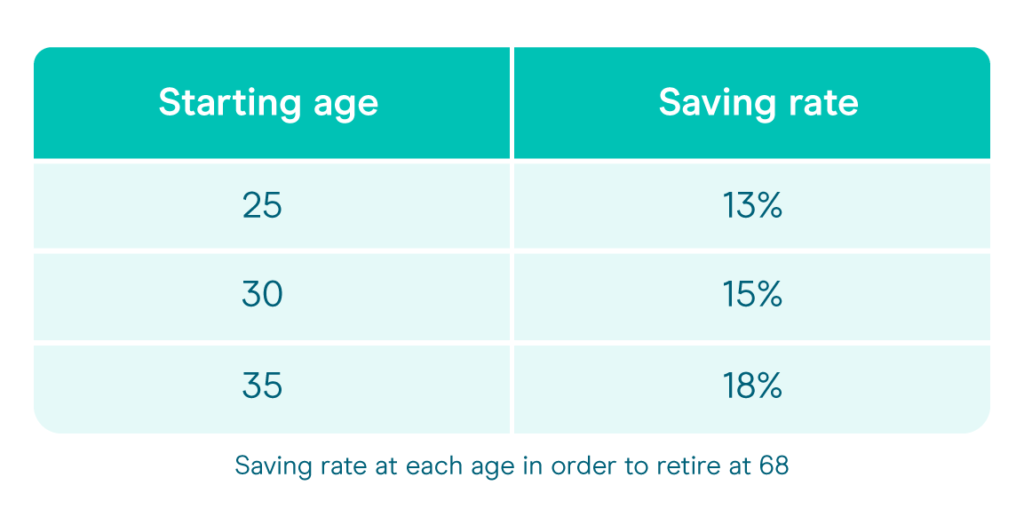 How much you save into your pension will differ based on when you start contributions. The same Fidelity report states – if you start saving at age 25 and keep going until you’re 68, you should aim to put away 13% of your income each year before tax into a pension to give you a similar standard of living in retirement as in working life (this includes both workplace and personal pensions as a total). However, if you don’t start until your 30th birthday, the recommendation increases to 15% of your annual income, and by age 35 it jumps to 18%.