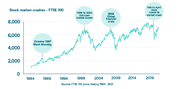 While they feel bad at the time, market crashes (when the stock market falls more than 20%) have happened throughout history (see graph below). And while past performance is not a reliable guide to future performance, so far 100% of market crashes have been followed by a recovery that more than recovers the fall. The chart below shows some of the most significant market declines between 1984 and 2021, along with the recovery.