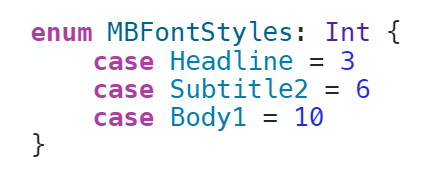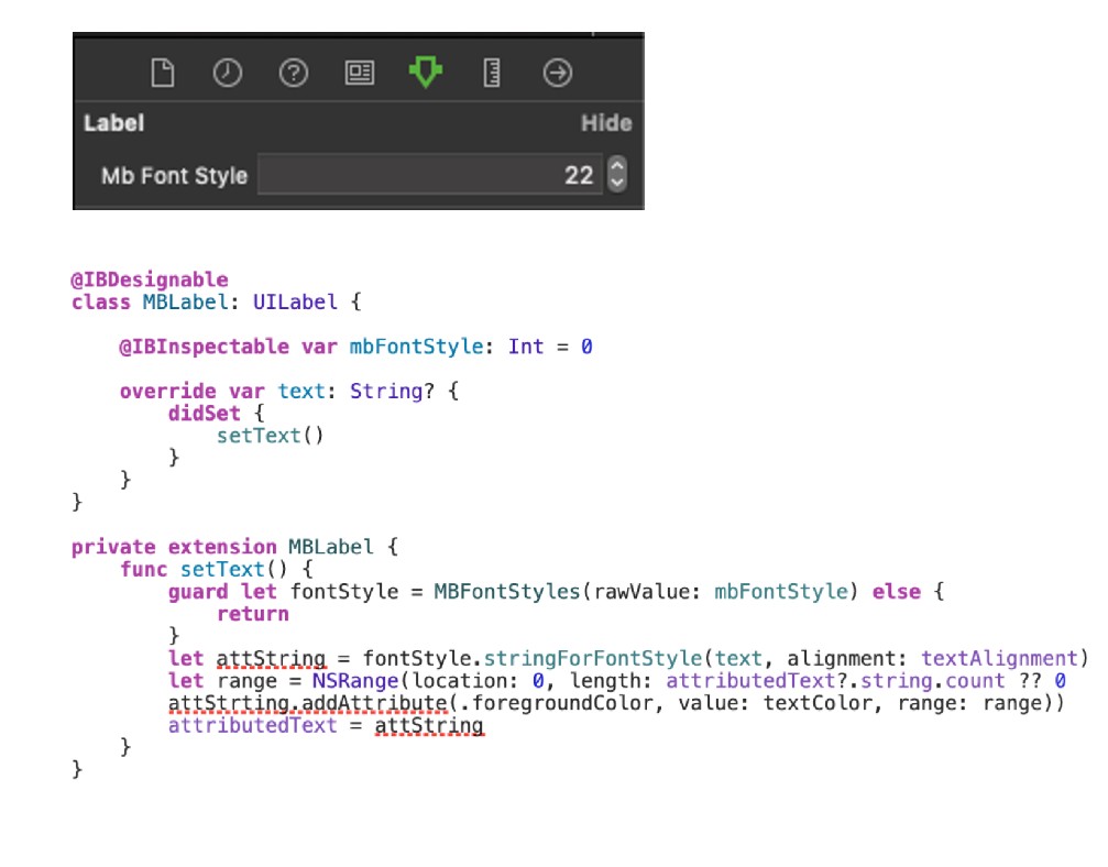 We can then implement MBLabel, as a subclass of UILabel. We override the text variable, calling setText on the didSet, resulting in setting the attributesText of the label, returned by fontStyle.stringForFontStyle IBInspectable allows us to set the style directly in the storyboard: