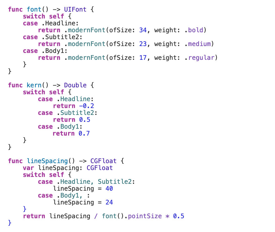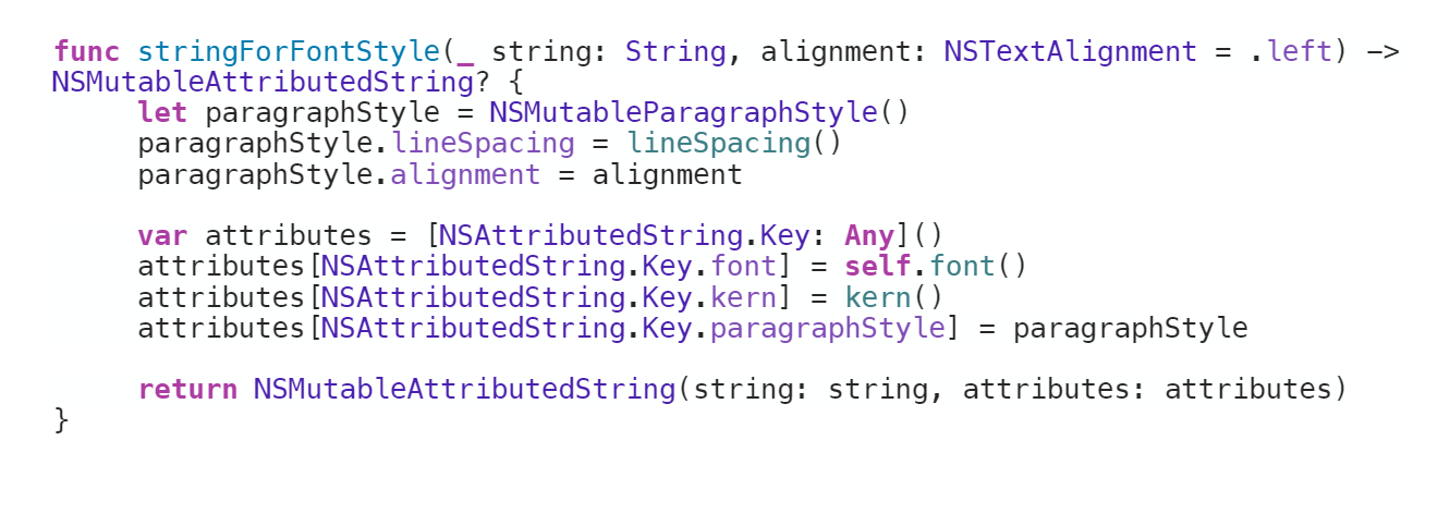 We then define a function returning NSMutableAttributedString, where we set the attributes of that text style that are needed – the font, kern, and alignment.